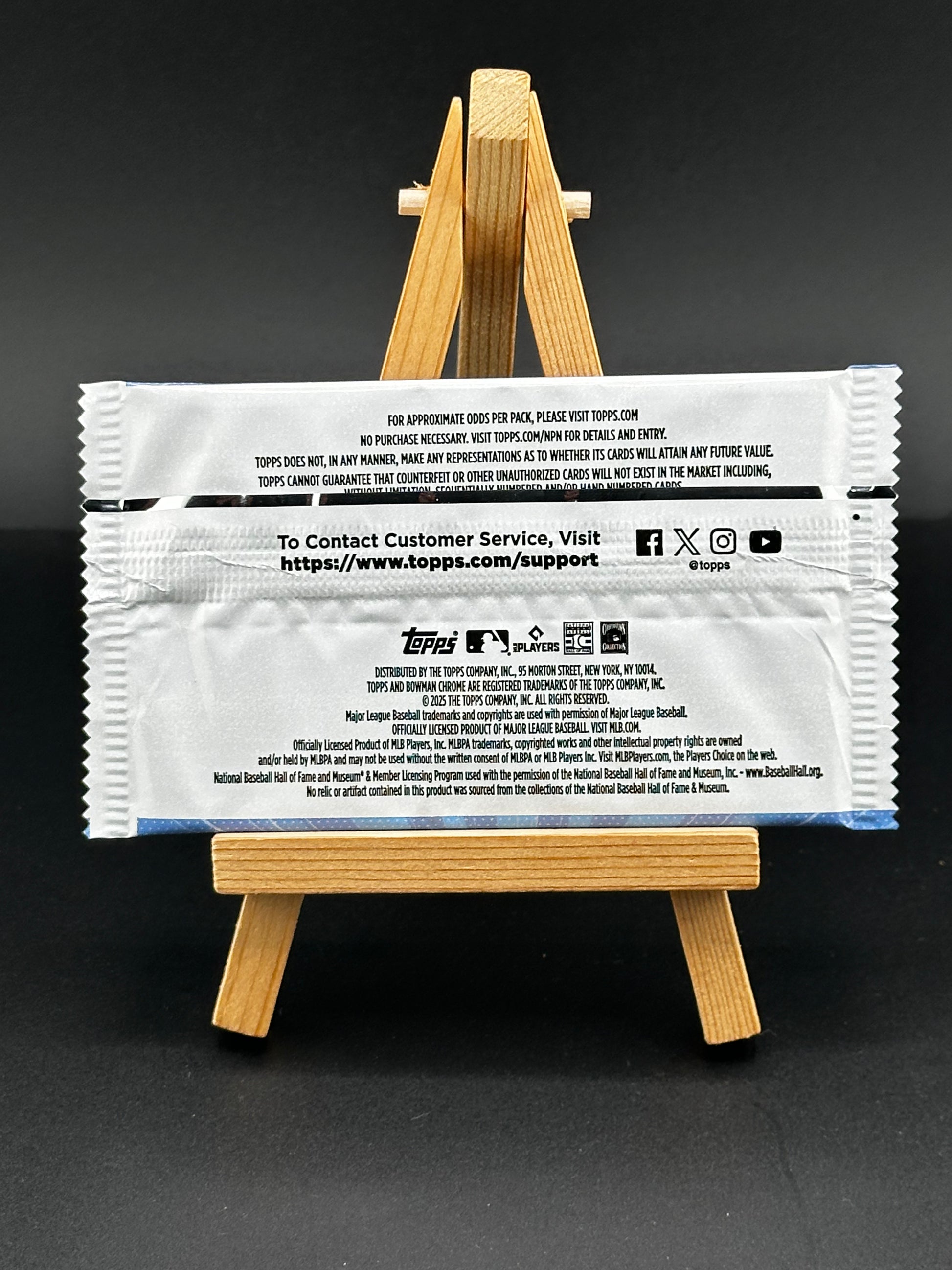 The 2025 Bowman Chrome Snack Pack is a rare additional pack that includes "snack-themed" parallels